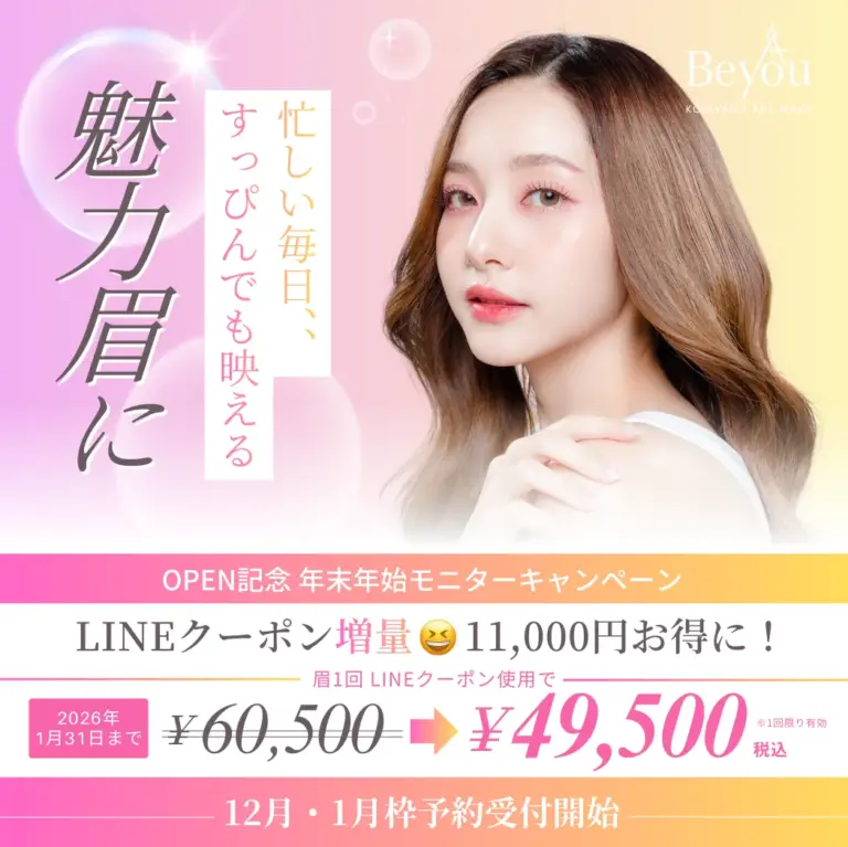 郡山アートメイクBeyou(ビーユー)では、医師と看護師による医療基準下でのアートメイクを提供。韓国風ふわ眉からナチュラルな眉まで、一人ひとりの骨格や好みにあわせたデザインで、自然で美しい仕上がりを実現します。衛生管理や安全性にも配慮されており、初めての方も安心。すっぴんでも眉が映える理想の眉を叶えたい方におすすめのクリニックです。