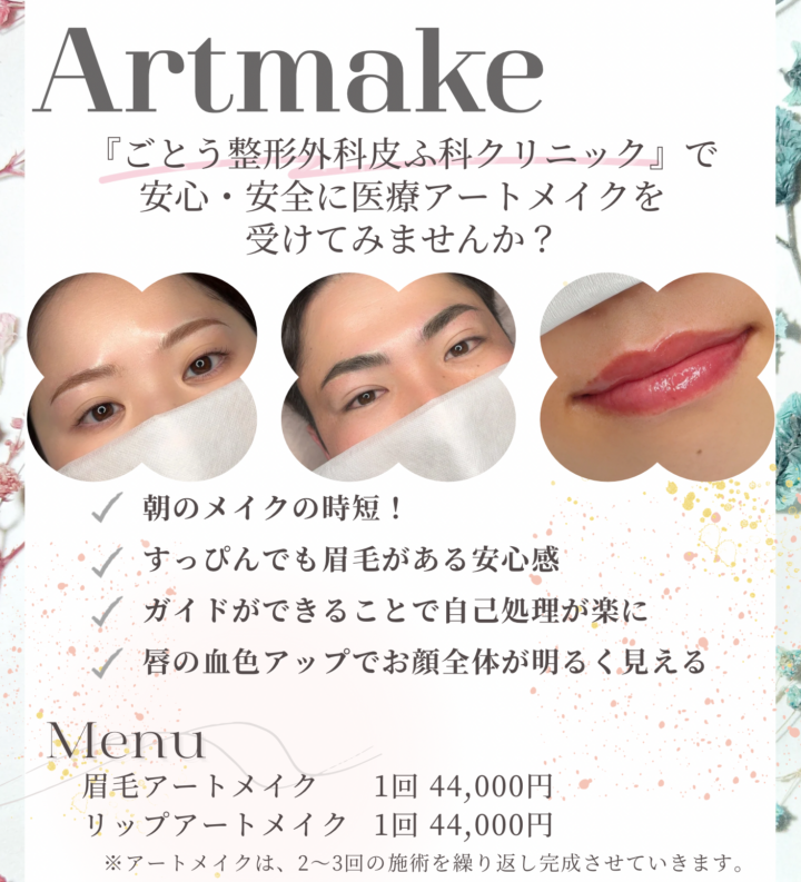 ごとう整形外科皮ふ科クリニックのアートメイクは、医師の監修のもと、安全性に配慮した医療環境で施術を受けられるのが特長です。眉・リップ・アイラインなど複数部位に対応し、骨格や顔立ちに合わせたナチュラルなデザインを提案。丁寧なカウンセリングで希望を細かく反映でき、初めての方でも安心して理想の仕上がりを目指せます。