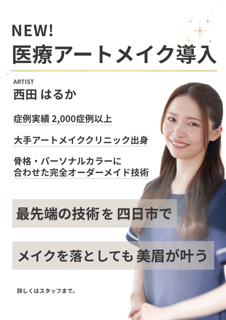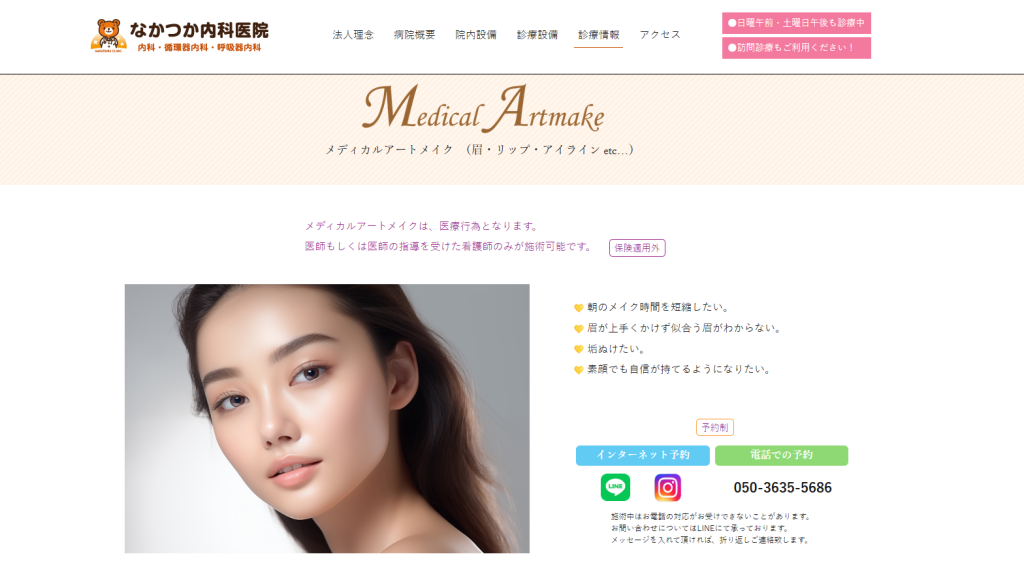 なかつか内科医院のメディカルアートメイクは、医師の管理下で看護師が施術する安心の医療アートメイクです。眉・アイライン・リップなど多部位に対応し、カウンセリングで希望や骨格に合わせた最適なデザインを丁寧に提案します。安全性と自然な仕上がりを重視している点が特長です。